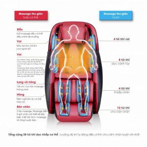 | Chức năng | Tích hợp máy tạo Ion Oxy (-) cung cấp không khí trong lành cho người dùng; Massage toàn thân, day bóp kèm hồng ngoại; phát hiện cơ thể, dò tìm huyệt đạo; 6 chức năng tự động, nâng dần và hạ dần tựa lưng, chân và massage bàn chân, xoa bóp từ ngoài vào trong, từ trong ra ngoài, vỗ, điều chỉnh lực xoa bóp và lực vỗ, massage khí nén cho bàn chân và mông. Chế độ không trọng lượng NASA. Hệ thống 28 túi khi điều chỉnh cường độ tự động. Kết nối Bluetooth, hệ thống loa cao cấp. |