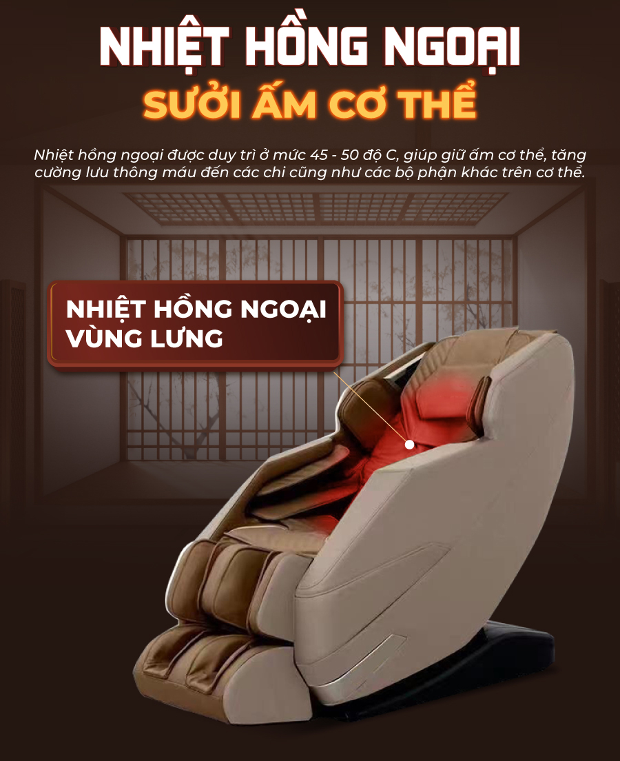Ghế massage được tích hợp cơ chế tỏa nhiệt trong khoảng 45 – 50 độ C, sưởi ấm cơ thể kết hợp các bài tập massage tự động, hỗ trợ cải thiện hệ tuần hoàn lưu thông, các bệnh lý về xương khớp, đau thần kinh tọa,…
