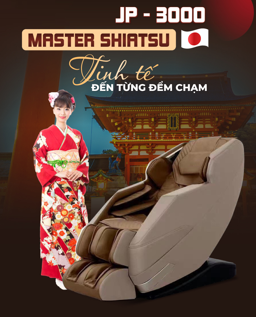 Ghế massage JP-3000: Master Shiatsu là sản phẩm được nhập khẩu nguyên chiếc từ Nhật Bản. Với lối thiết kế đơn giản nhưng vẫn hội tụ các tính năng của thiết bị massage cao cấp, JP-3000 hứa hẹn là sản phẩm ghế Nhật cho người Việt hàng đầu trên thị trường!