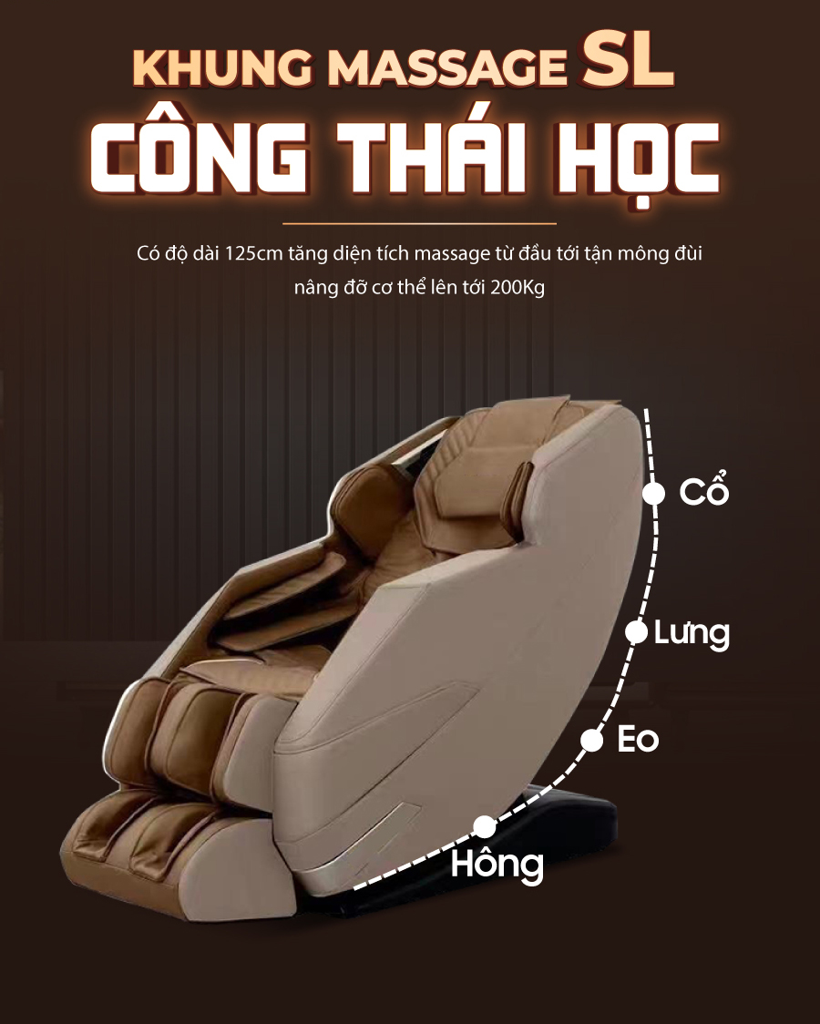 Khung massage SL Công thái học có độ dài 125cm, tăng diện tích massage từ đầu tới tận mông đùi, nâng đỡ cơ thể lên tới 200kg, đảm bảo an toàn khi sử dụng.