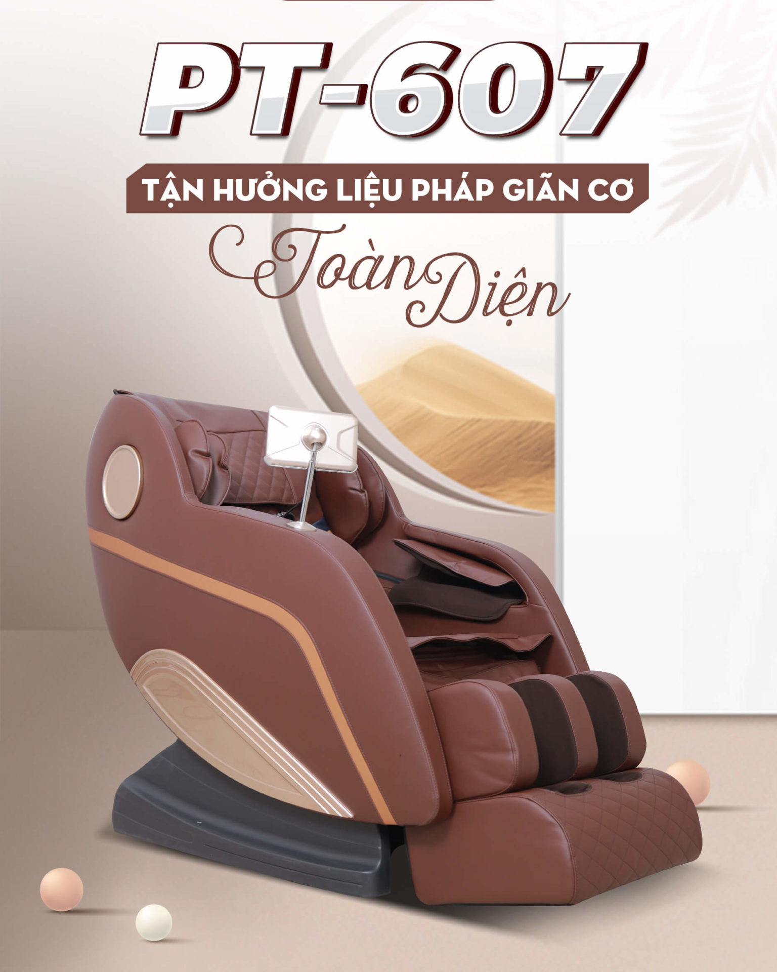 Ghế massage PT-607 là sự kết hợp hoàn hảo của 2 gam màu chủ đạo là màu nâu gỗ và màu cát vàng – Sắc màu đặc trưng cho phong cách thiết kế nội thất Tropical mang dấu ấn của vùng đất nhiệt đới.
