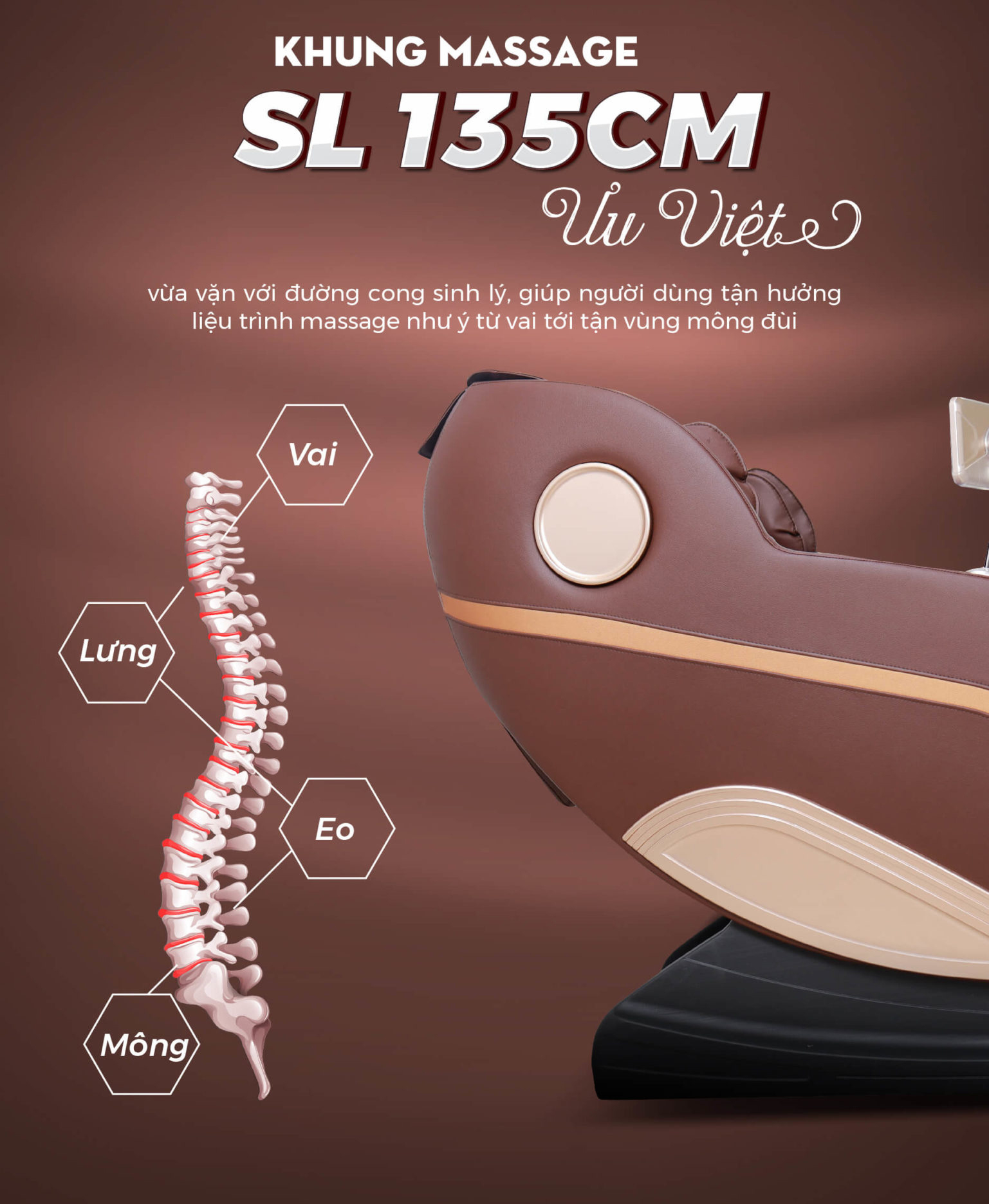 Với mục đích nâng cao hiệu quả giãn cơ, ghế PT-607 được Toshivina thiết kế trục massage SL có chiều dài 135cm giúp mở rộng phạm vi tác động của bi lăn từ vùng cổ đến tận mông đùi.
