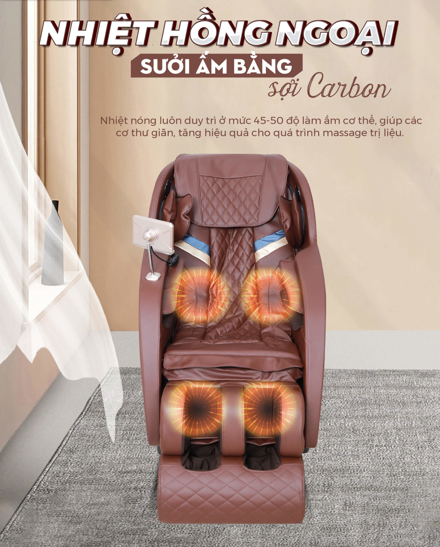 Nhiệt hồng ngoại sử dụng trên ghế massage PT – 607 được tỏa ra từ các sợi carbon, có mức nhiệt duy trì từ 45-50 độ, thẩm thấu qua làn da để làm ấm cơ thể và giãn nở các mạch máu. Phần nhiệt này khi kết hợp với hoạt động của bi lăn và các túi khí co bóp nhịp nhàng sẽ hỗ trợ tăng khả năng lưu thông khí huyết trên toàn cơ thể, để người dùng dễ dàng đi vào giấc ngủ.
